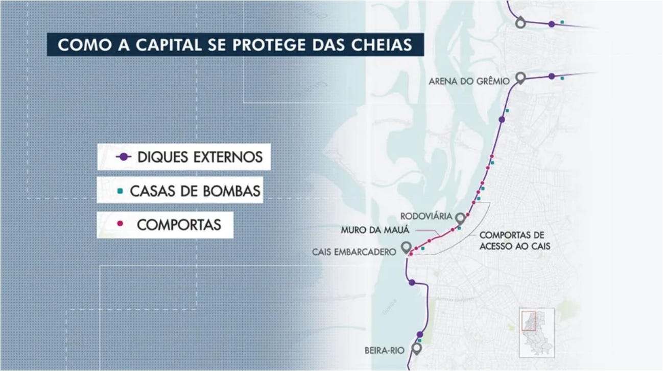 Porto Alegre tem uma relação complexa com o Guaíba. Assim mesmo, descrito como gente, como um corpo vivo, parte de uma relação umbilical e impossível de separar, de dissolver. Tem muitas coisas que as pessoas não se dão conta sobre Porto Alegre, e que eu mesmo só entendi quando comecei a vir e eventualmente me mudei pra cidade. Em primeiro lugar, que Porto Alegre não é alta, não está na ‘Serra Gaúcha’. A cidade fica ao nível do mar. Na beira de um lago/estuário gigantesco, de 500km² que recebe a água de vários grandes rios, e serve de ponto de passagem até esse volume alcançar a Lagoa dos Patos e desembocar no mar em Rio Grande, 300 km ao sul do estado. Esse conjunto de características, estar na beira de uma grande massa de água protegida do oceano e com acesso seguro por terra ao interior, é o que dá nome a cidade, até porque o litoral do Rio Grande do Sul, selvagem e sem proteção, não tem muitos lugares adequados para um grande porto marítimo. Porto Alegre sempre foi, então, relativamente segura e protegida. Relativamente porque tem o Guaíba, ali na frente. Que apesar de plácido por padrão, sem ondas nem grandes ventos, é um reflexo do comportamento dos rios que o alimentam. E até é capaz de equilibrar e compensar o mal comportamento de um deles. Mas às vezes, em períodos que ficaram muito mais próximos recentemente, vários desses rios enchem ao mesmo tempo, e aí o Guaíba sobe, devagar, mas inexoravelmente, em direção a cidade de Porto Alegre e suas vizinhas Guaíba e Eldorado. Para isso existe o que chamamos simplesmente de ‘Muro’. Uma estrutura complexa e única no país, com 68 km de diques, 14 comportas e 23 casas com grandes bombas capazes de movimentar 170 mil litros de água por segundo. Uma estrutura hercúlea feita para conter e expulsar de volta a água que eventualmente ameace a cidade, que foi construída a partir da última cheia, em 1941, ao longo de décadas, e sempre resistiu, com exceção desta semana, em que o Guaíba alcançou níveis históricos, que muitos especialistas consideravam impossível, até que aconteceu. Por incrível que pareça, e mesmo em meio às demandas críticas geradas pela cheia, esta enchente poderia ser muito pior não fosse a grande barreira, que fez seu papel pelas últimas muitas décadas, e está fazendo hoje, resistindo em sua maior parte, ainda que sob pressão extrema. Uma obra essencial, que terá que ser revista, repensada e certamente ampliada para alcançar as cidades ao redor, para atender as necessidades de uma natureza ainda mais furiosa com o aquecimento global, se pretendemos continuar habitando esta região, que em breve precisará ser reconstruída. |